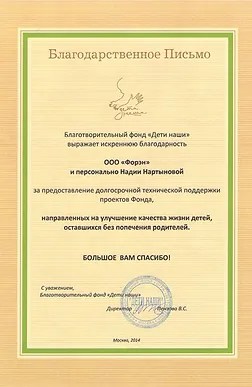 “Агентство «Фокус Плюс» благодарит компанию «ФОРЭН » за многолетнее сотрудничество, профессионализм, своевременность, оперативность, ответственное отношение к работе. Мы очень надеемся на дальнейшую плодотворную работу с Вашим коллективом. Желаем Вашей компании новых достижений и финансового благополучия!”