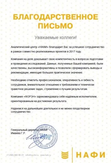 Мы надеемся на дальнейшее сотрудничество и рекомендуем ООО «ФОРЭН» как надежного партнера в реализации полевых задач таких видов исследований как личные опросы, фокус-групповые дисскуссии и другое.